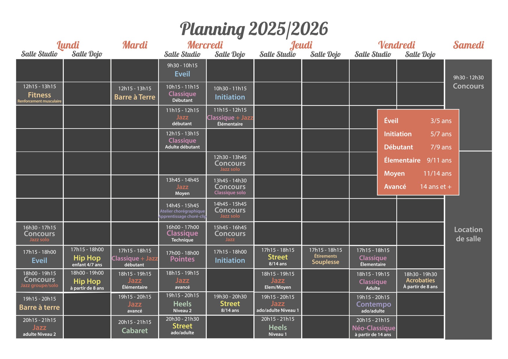 Les cours sont accessibles dès l’âge de 4 ans (cours éveils et initiations) jusqu’à l’âge adulte (barre au sol, jazz, contemporain).